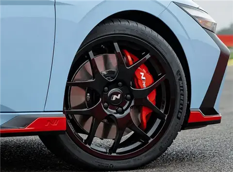 外观方面,新车整体设计遵循伊兰特N的思路,但增加了更多空气动力学套件。例如,新车配备了红色装饰点缀的前唇扰流板、双五辐的19英寸N TCR锻造轮圈以及前四活塞的固定式制动卡钳,进一步提升了整体赛道性能。