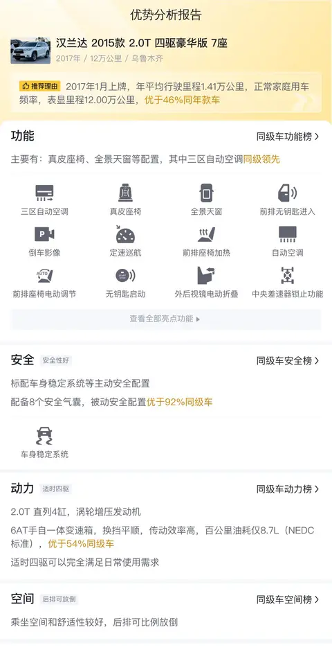该车是一款汉兰达 2015款 2.0T 四驱豪华版 7座车型,外观颜色为白色,内饰颜色为深色。车源地和上牌地均为乌鲁木齐。同时截至至今累计行驶里程为12万公里,该车符合国IV排放标准,有两 次过户记录,首次上牌时间为2017年1月。