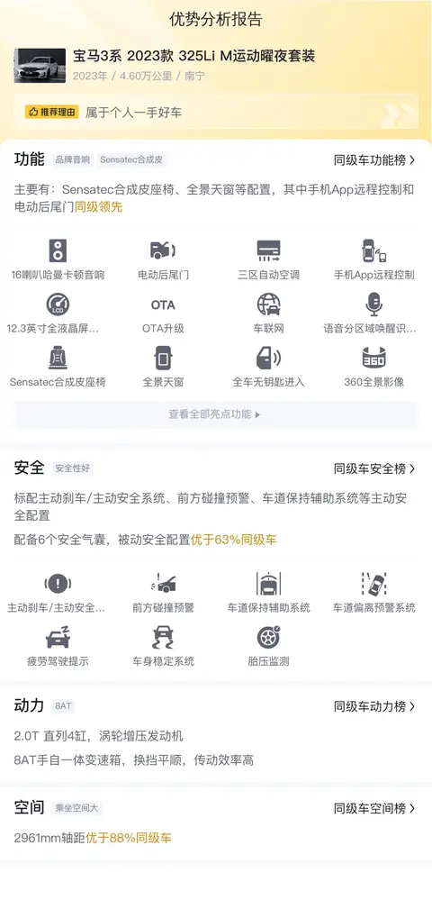 [这台2023年款的宝马3系325LiM运动曜夜套装,作为一款准新车,它的车况自然备受瞩目。表显里程4.6万公里,上牌地车源地均为南宁,不仅意味着它在地理移动上保持着相对的静止,更暗示着它在日常使用中的稳定与可靠。作为一辆无过户记录的个人一手车,这份纯粹与简单,无疑为它增添了几分神秘而诱人的色彩。