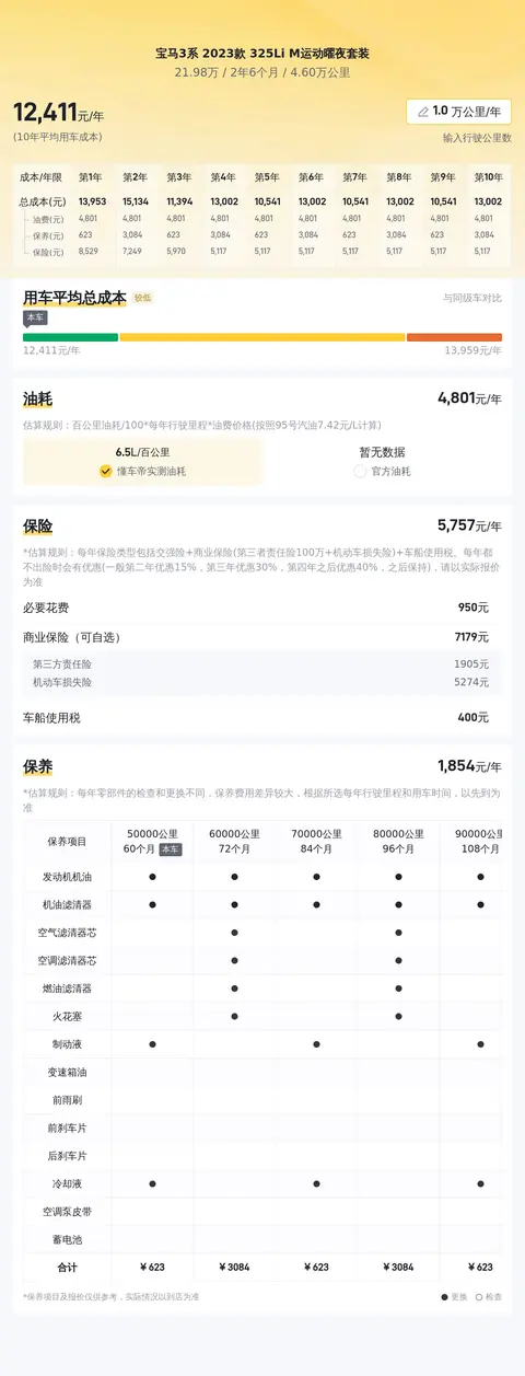 [当前市场行情显示,类似车况的2023款宝马3系325LiM运动曜夜套装二手车价格大致位于21.21万至25.71万之间。当然,具体的成交价格会受到车辆状况、里程数、维护记录等多种因素的共同作用。就本文讨论的这辆特定的准新车而言,其售价被合理定位为21.98万元。在用车成本方面,这辆宝马3系325LiM运动曜夜套装的表现同样均衡且合理。年均综合用车成本大约为1.2万元左右,这一数字充分考虑到了车辆维护、保险以及日常使用消耗等方面的合理支出。