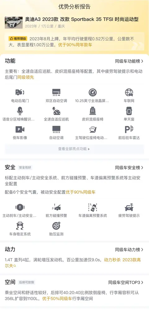 当前市场上,这款奥迪A3的二手车价格大约在13.13万元至15.72万元之间,而本车的报价为12.78万元,这样的价格让本车具有不错的竞争力。当然,具体的售价会受车辆状况等因素的影响。