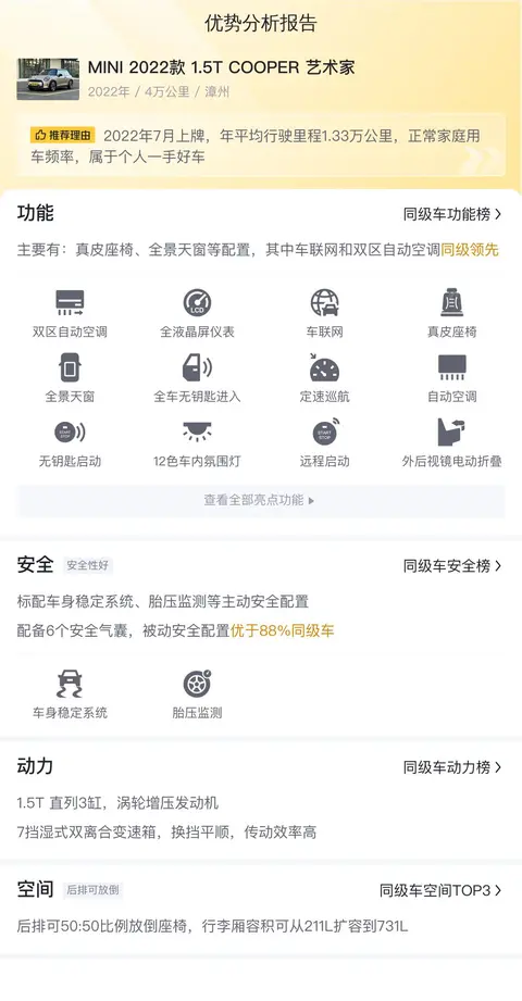 优势:MINI COOPER艺术家的配置还不错,有全速自适应巡航、驻车雷达、倒车影像、车联网、语音识别控制系统等配置,车况也良好,价格也算合适,整体来说还是挺不错的。