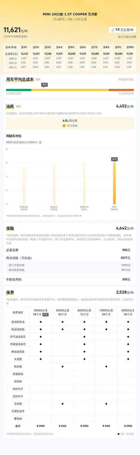 同时,同级车的最低10年平均用车成本是11729元/年,最高是16333元/年,而这辆MINI 2022款 1.5T COOPER 艺术家是12170元/年,也算是正常水准。