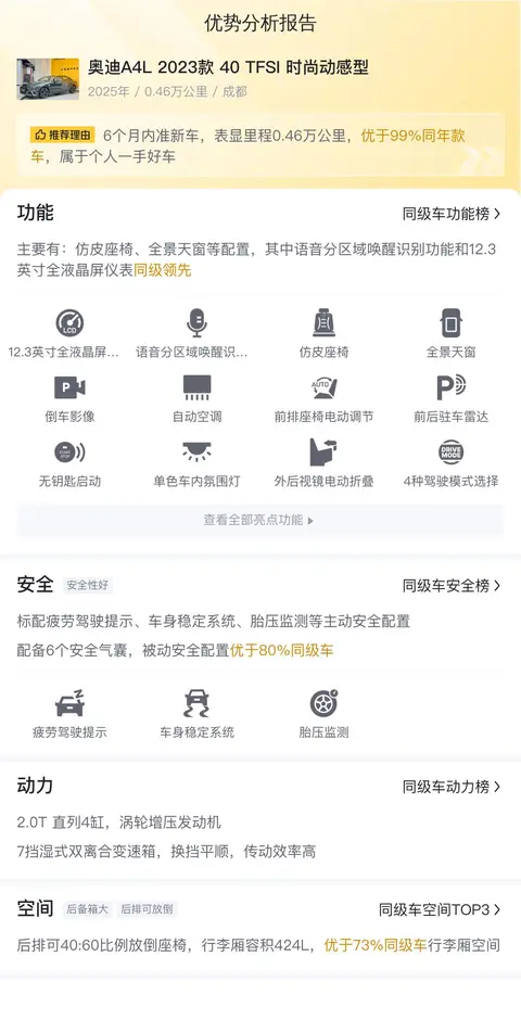 多年来,奥迪A4不断推陈出新,每一代车型都承载着奥迪品牌的精髓和创新精神。而奥迪A4L作为A4系列的加长版车型,更是为了满足中国市场消费者对于后排空间的更高需求。它不仅继承了奥迪A4的优秀基因,更在车身尺寸和内部空间上进行了精心优化,为乘客提供了更加宽敞舒适的乘坐环境。今天我们就为您带来一辆二手奥迪A4L,具体版本为奥迪A4L 2023款 40 TFSI 时尚动感型,该车搭载2.0T直列4缸涡轮增压发动机,匹配7挡湿式双离合变速箱,换挡平顺,传动效率高。NEDC综合油耗为6.1L/100km,官方百公里加速时间为8.2s,百公里油耗仅6.1升,充分展现了奥迪科技在节能减排方面的实力。车身尺寸方面,奥迪A4L 2023款 40 TFSI 时尚动感型的长宽高分别为4858mm、1847mm和1439mm,轴距达到2908mm,为乘客创造了宽敞的乘坐空间。后排可40:60比例放倒座椅,行李厢容积424L,优于73%同级车行李厢空间,无论是家庭出行还是商务接待,都能轻松应对。该车配备了仿皮座椅、全景天窗等配置,其中语音分区域唤醒识别功能和12.3英寸全液晶屏仪表同级领先,让您尽享科技带来的便捷与舒适。驾驶辅助方面,奥迪A4L拥有前后驻车雷达、倒车影像等实用配置,为您的行车安全保驾护航。智能互联方面,车载导航系统、CarPlay手机互联映射等配置一应俱全,让您的驾驶体验更加智能便捷。舒适配置方面,车内氛围灯、自动空调等配置营造出温馨舒适的驾乘环境。奥迪A4L 2023款 40 TFSI 时尚动感型承袭了奥迪品牌的卓越品质和精湛工艺,同时在动力、油耗、空间等方面表现出色,是一款集优雅与性能于一身的豪华轿车。无论是日常通勤还是长途旅行,它都能为您提供卓越的驾驶体验和舒适的乘坐感受。如果您正在寻找一款既能展现个人品味又能满足各种出行需求的车型,奥迪A4L 2023款 40 TFSI 时尚动感型无疑是您的理想之选。