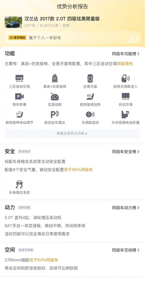 这辆汉兰达2017款2.0T四驱炫黑限量版主要有:真皮+仿皮座椅、全景天窗等配置,其中三区自动空调同级领先。动力上,2.0T 直列4缸,涡轮增压发动机,6AT手自一体变速箱,换挡平顺,传动效率高,适时四驱可以完全满足日常使用需求。轴距2790mm,优于53%同级车,乘坐空间和舒适性较好,后排可比例放倒。