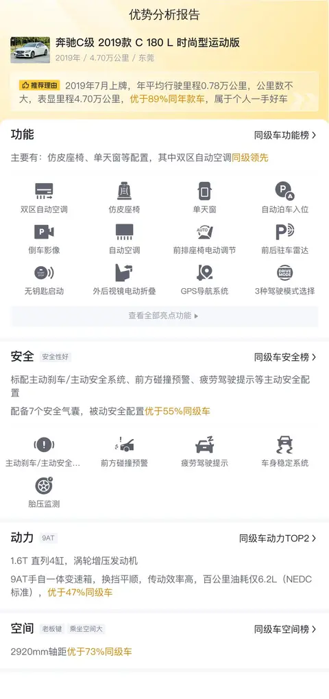 总体来说,这辆奔驰C级 2019款 C 180 L 时尚型运动版的价格并不算高,毕竟开近七年的时间了,从用车成本来看,它比较适合那些追求性价比,同时又向往豪华品牌的消费者。如果你不介意奔驰c级的后排空间表现,那么选择它作为代步车倒也没什么问题。