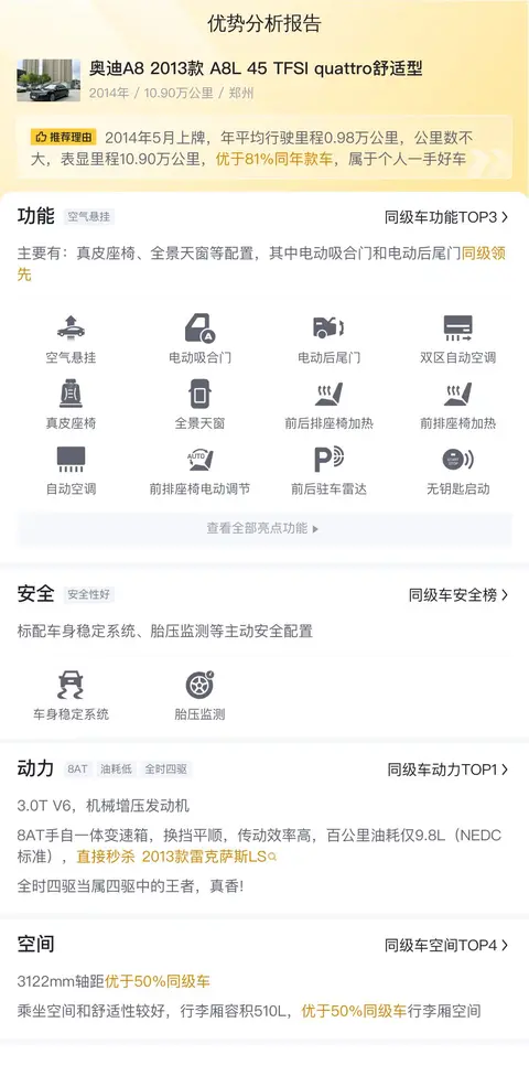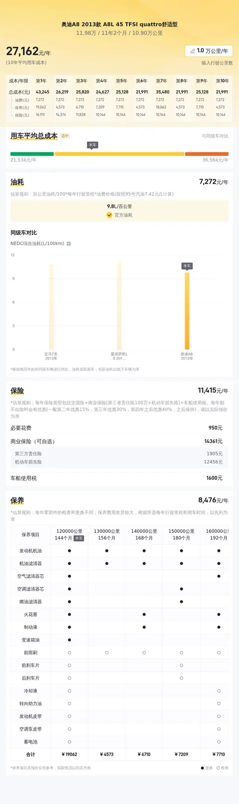 根据懂车帝的大数据分析,这款奥迪A8L 45 TFSI quattro舒适型的10年平均用车成本约为26,683元/年,相较于同级别车型,其用车成本处于较高区间。这一数据可以帮助消费者更全面地评估持有该车型的经济成本,为购车决策提供参考依据。