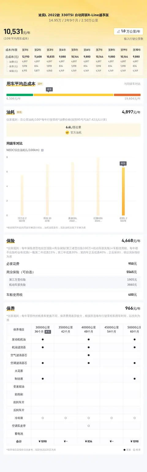 据估算,同级车的最低用车成本是6506元/年,最高是13181元/年,途观L 2022款 330TSI 自动两驱R-Line越享版是11377元/年,用车成本较高。