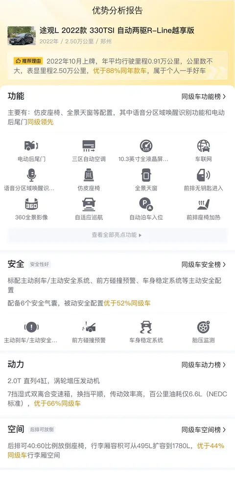 综上所述,途观L 2022款 330TSI 自动两驱R-Line越享版以其丰富的配置、出色的操控和较高的保值率,是一款性价比较高的二手车选择。尤其是对于追求驾驶乐趣和舒适性的消费者来说,这款车更是值得考虑。然而,需要注意的是,用车成本相对较高,长期使用可能会增加经济负担。同时,市场竞争日益激烈,类似配置的车型不断涌现,这也为消费者提供了更多选择。总体而言,途观L 2022款 330TSI 自动两驱R-Line越享版是一款集豪华与实用于一体的二手车,但在做出购买决策之前,建议您对车辆进行全面了解和对比,以确保其符合您的具体需求和预算。