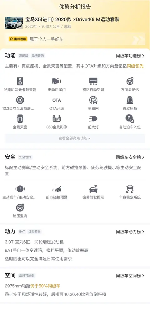 该车是一款宝马X5(进口) 2020款 xDrive40i M运动套装,白色外观,2020年5月上牌,行驶里程9.4万公里,符合国VI排放标准,车源地及车牌地均为成都,未曾过户。现售价为35.8万元,相比新车指导价75.99万元,价格优惠了40.19万元。按10年分期计算,首付10.7万元,月供仅需1.9万元。