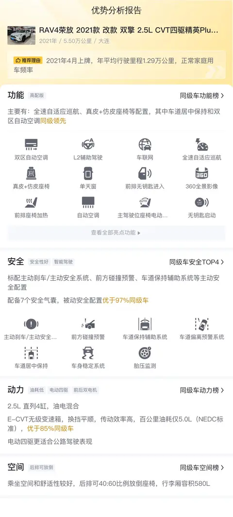 咱们今天要介绍的这辆二手RAV4荣放2021款改款双擎2.5L CVT四驱精英Plus版,车源地是大连,上牌时间是2021年4月,过户次数为1次,行驶里程5.50万公里,新车含税价26.9万,现在二手报价15.98万。