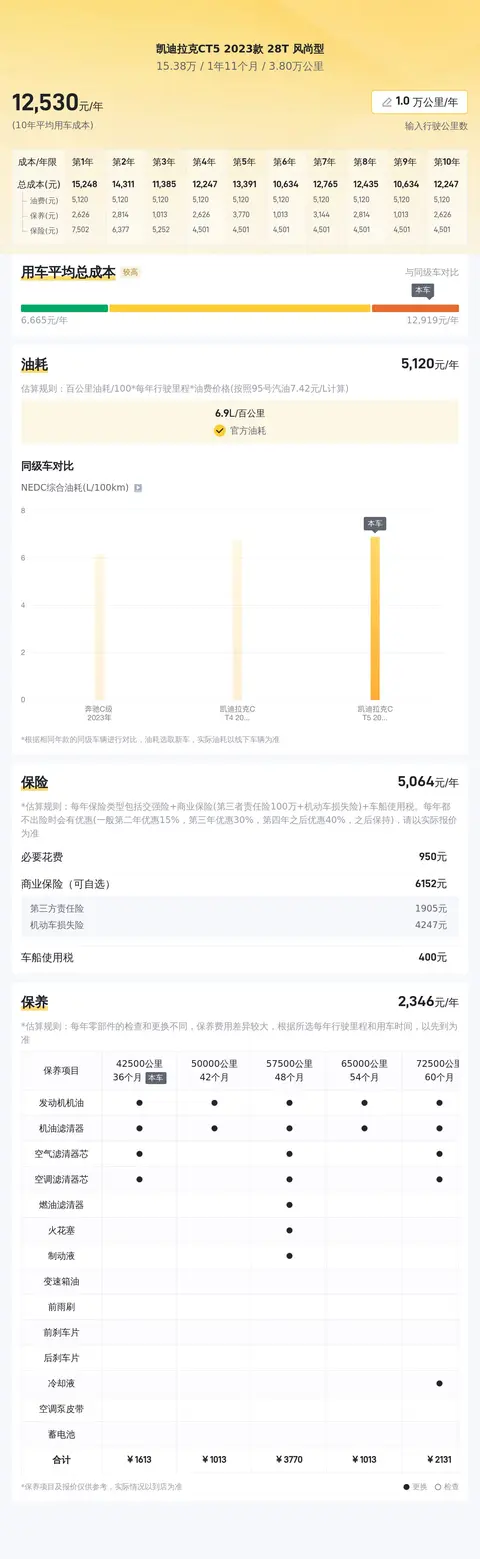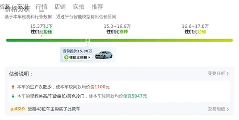 根据大数据预估显示,这辆车的市场价格在14.98万至17.96万之间。具体的价格因车辆的车龄、里程、车况等因素而有所不同。在用车成本方面,如上图所示,这辆车的年均综合用车成本大概在每年1.3万元左右。具体金额根据用车强度和环境等因素有所改变。