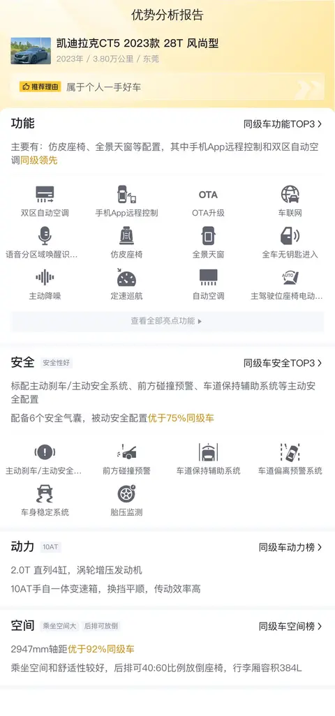 如上图所示,在优势分析报告中,这辆凯迪拉克CT5 2023款 28T 风尚型在动力、空间等方面具有一定优势。同时在弱点部分,如上图所示,这辆车也存在一些不足之处,如油耗相对较高。