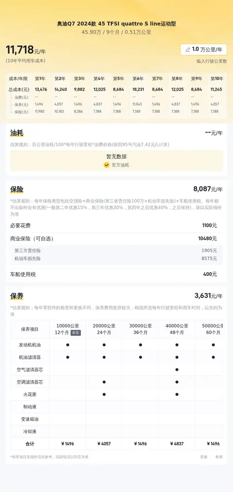 奥迪Q7 2024款 45 TFSI quattro S line运动型10年平均用车成本是16070元/年,也算是正常水准。