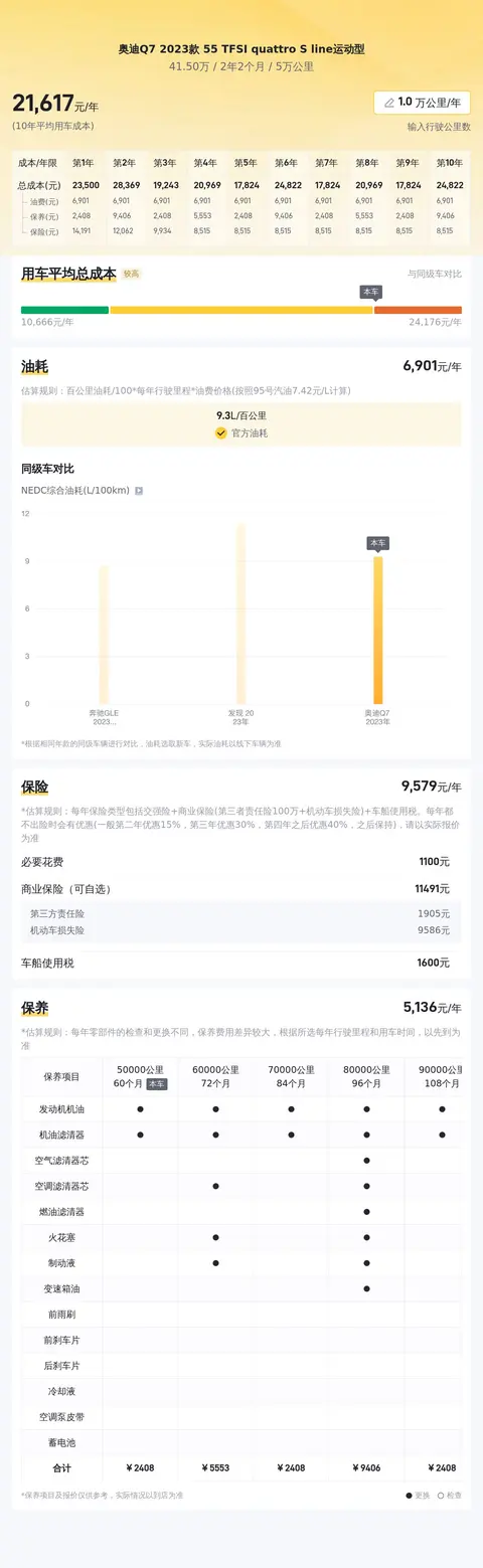 据估算,同级车的最低用车成本是17045元/年,最高是24156元/年,奥迪Q7 2023款 55 TFSI quattro S line运动型是21688元/年,所以用车成本适中。