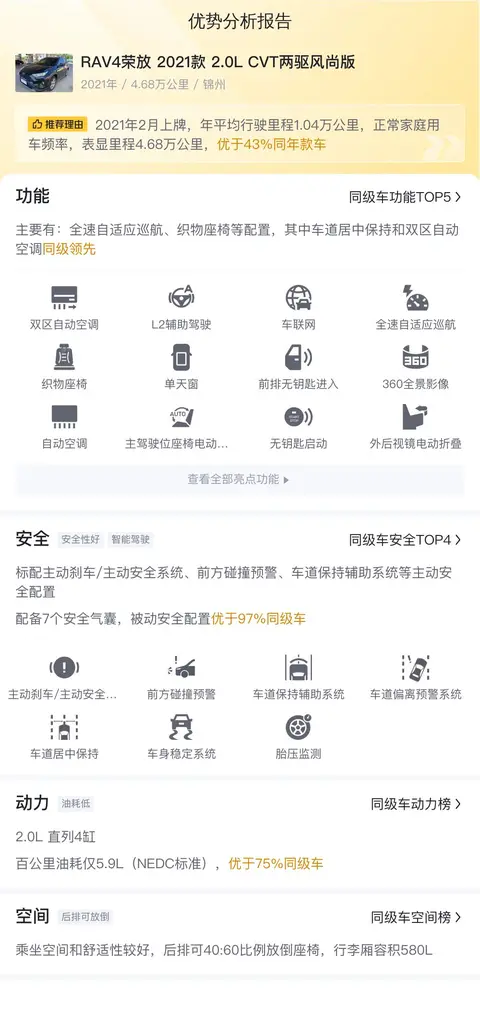 据估算,同级车的最低用车成本是5090元/年,最高是12798元/年,RAV4荣放 2021款 2.0L CVT两驱风尚版是9057元/年,所以用车成本不算低。