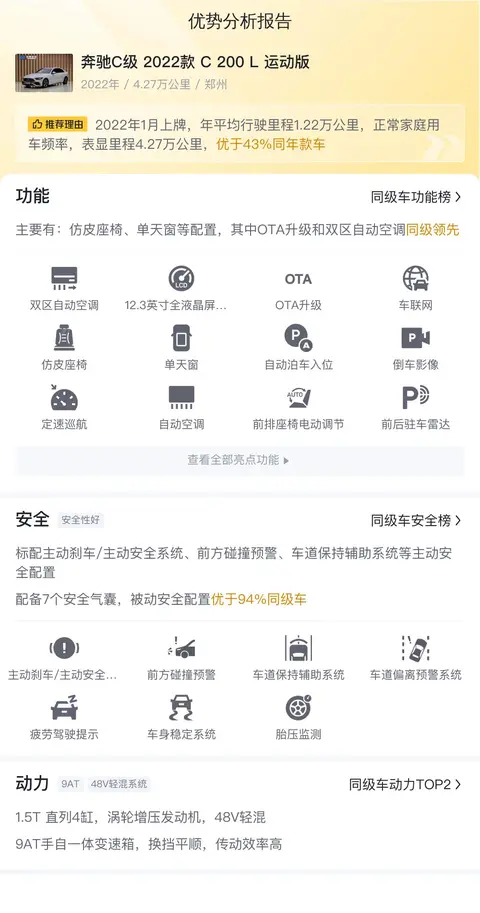 奔驰C级2022款C200L运动版是一款集豪华、动力、操控于一体的三厢车。它搭载的1.5T直列4缸涡轮增压发动机加上48V轻混系统,为车辆提供了充沛的动力,同时降低了油耗和排放。9AT手自一体变速箱则使得换挡更加平顺,提高了驾驶的舒适性和乐趣。车内豪华舒适的内饰以及各种智能驾驶辅助系统,都为驾乘者提供了更加安全、便捷和愉悦的行车体验。在选购二手车时,奔驰C级2022款C200L运动版也是一个不错的选择。