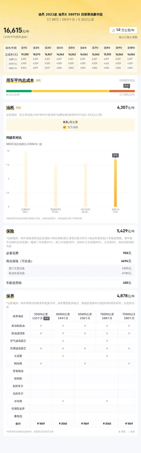 据估算,同级车的最低用车成本是6506元/年,最高是17666元/年,途昂 2021款 途昂X 380TSI 四驱尊崇豪华版是16634元/年,用车成本也比较高。
