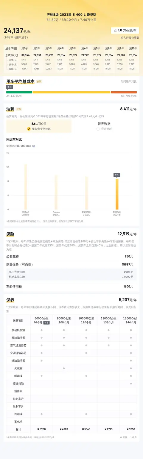 车是消耗品,除了购车成本,还要考虑用车成本和养车成本,当然这部分费用跟每个人的用车场景和使用强度有直接关系,不好一概而论,根据懂车帝对这款车的分析,它的10年平均用车成本大概是23603元/年,供您参考。