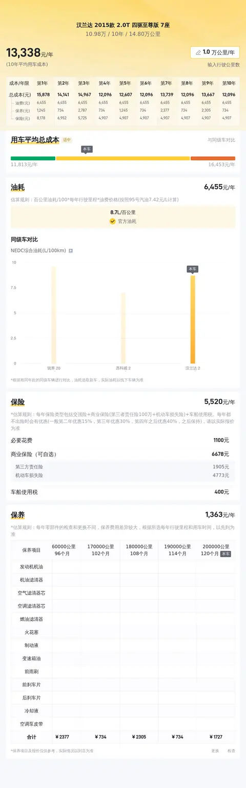 据估算,汉兰达 2015款 2.0T 四驱至尊版 7座的用车成本较低,因为它的用车成本是13156元/年,同级车最低用车成本是11469元/年,最高用车成本是14771元/年。