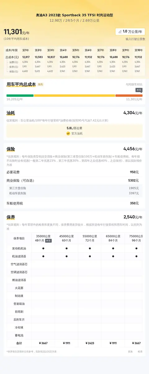 这辆车的10年平均用车成本是11467元/年,2025年的保险费用预估是4691元,保养费用预估是1682元。