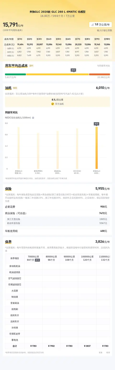 不过,购买二手车不仅要考虑购车成本,还要考虑到日常使用成本。根据估算,这辆奔驰GLC 2020款 GLC 260 L 4MATIC 动感型的10年平均用车成本大概是 16469元/年,虽说不算低,但也是正常范围内。