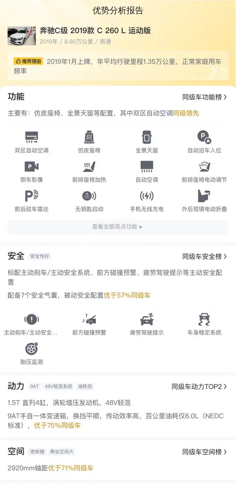 今天介绍的这款奔驰C级 2019款 C 260 L 运动版二手车,车源地为南通,上牌日期2019年1月,过户次数为1次,行驶里程8.9万公里,排放标准国V/国VI,新车指导价35.08万,二手车报价14.68万,车身颜色为白色。