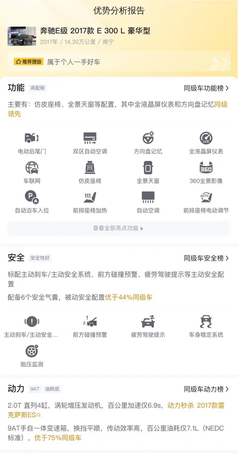 这辆奔驰E级 2017款 E 300 L 豪华型在配置方面表现出色,配备了仿皮座椅、全景天窗、全液晶屏仪表、方向盘记忆等豪华配置,其中全液晶屏仪表和方向盘记忆在同级别车型中处于领先地位。在动力方面,该车搭载的2.0T直列4缸涡轮增压发动机提供了强劲的动力输出,百公里加速仅需6.9秒,优于2017款雷克萨斯ES等竞品车型。同时,9AT手自一体变速箱确保了换挡的平顺性和高效的传动效率,百公里油耗仅为7.1升(NEDC标准),优于75%的同级别车型。在车身尺寸方面,5065mm的车长、1860mm的车宽和1467mm的车高,轴距达到了3079mm,为乘客提供了宽敞的乘坐空间和舒适的乘坐体验。综合来看,这辆奔驰E级 2017款 E 300 L 豪华型在配置、动力和空间等方面均表现出色,是一款值得推荐的二手车选择。