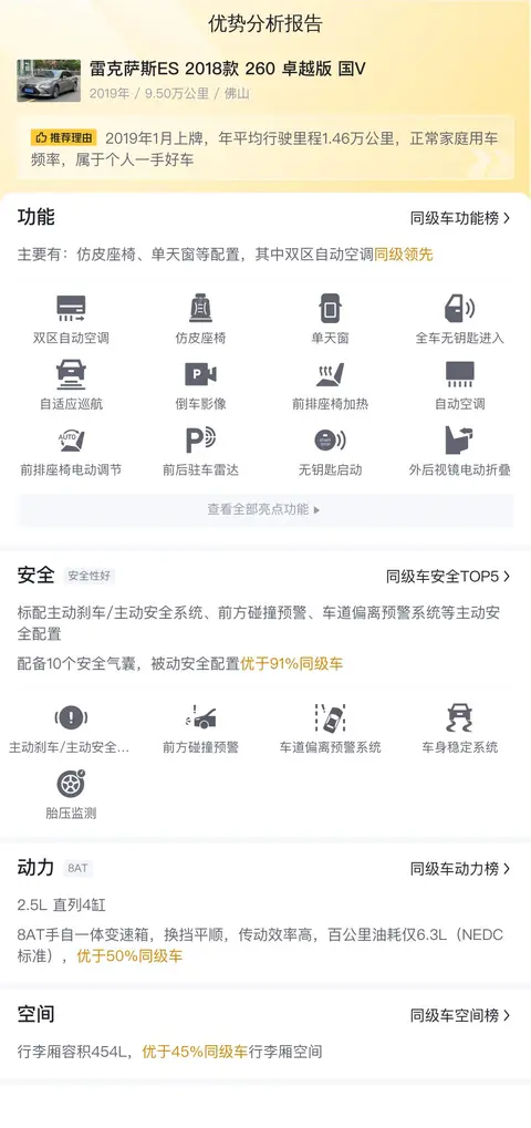 优势:雷克萨斯ES 2018款 260 卓越版 国V拥有卓越的燃油经济性和舒适的乘坐体验。其精致的内饰和合理的动力输出,使得它在长途旅行时尤为出色。此外,车辆的保值能力和可靠性也是其不可忽视的优势。