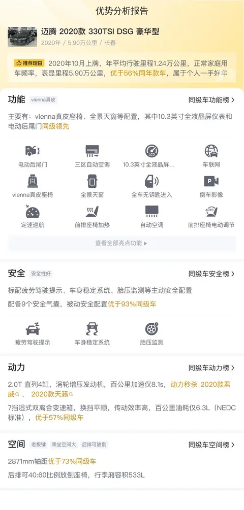 根据懂车帝官方大数据分析,与同级别车型相比,迈腾 2020款 330TSI DSG 豪华型在多个方面展现了其独特的竞争优势。特别是在动力性能与空间表现上,这款车凭借其2.0T发动机所提供的充沛动力以及宽敞舒适的乘坐空间,赢得了用户的广泛好评。同时,迈腾330TSI豪华型还以其丰富的配置、出色的性价比以及较高的保值率吸引了众多消费者的关注。然而,数据分析也显示出该车型在内饰材质与科技配置方面存在一定的提升空间。部分用户认为,尽管迈腾的整体品质令人满意,但在内饰用料与最新科技装备方面,它与某些直接竞争对手相比尚有差距。这一分析结果为潜在买家提供了有价值的参考信息,帮助他们在做出购买决策时能够更加全面地评估迈腾330TSI豪华型的优劣得失。