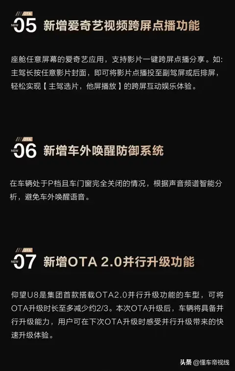 仰望U8越野玩家版获V2.3.1版本OTA升级,其中包括:新增云辇路面预瞄、新增手车互联、新增智能语音10语种方言识别、新增AI个性化歌单、新增爱奇艺视频跨屏点播、新增车外唤醒防御、新增OTA 2.0并行升级、新增App一键备车等。