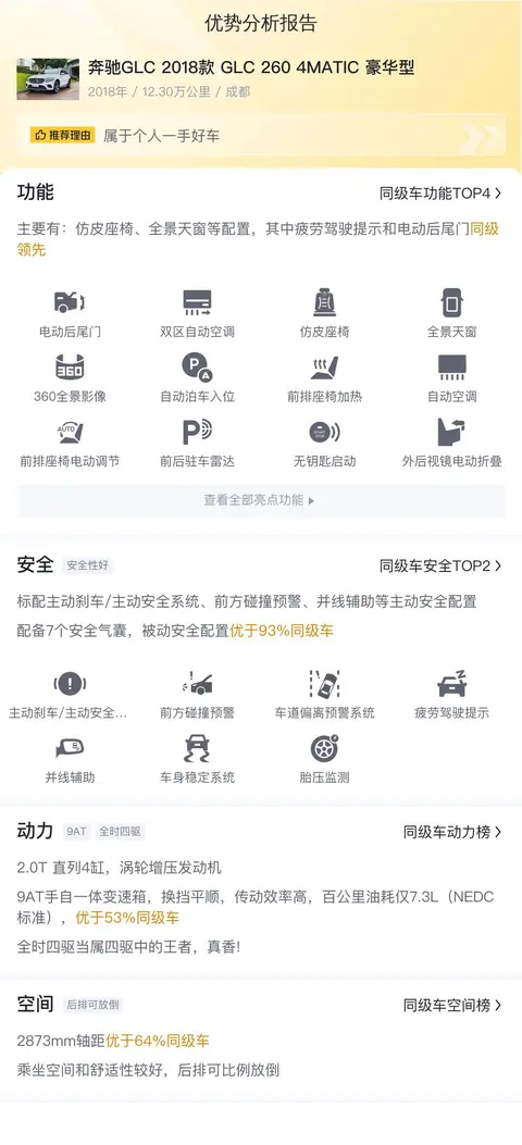 总体而言,这款奔驰GLC 2018款 GLC 260 4MATIC 豪华型在各个方面都表现出色。它拥有宽敞舒适的内部空间、强劲的动力配置和卓越的操控性能,无论是家庭出行还是商务接待都能轻松应对。此外,它的售价也非常合理,对于想要购买一款高品质二手车的消费者来说,无疑是一个非常不错的选择。当然,在购买二手车时,我们也需要注意一些细节问题。首先是要确保车辆的合法性和手续的完整性,避免因为手续不全或者存在纠纷而给自己带来不必要的麻烦。其次是要注意车辆的保养情况,确保它在购买后能够持续保持良好的状态。最后是要考虑自己的实际需求和预算情况,选择最适合自己的车型和配置。只有这样,才能让自己在购买二手车时真正做到物有所值、心满意足!