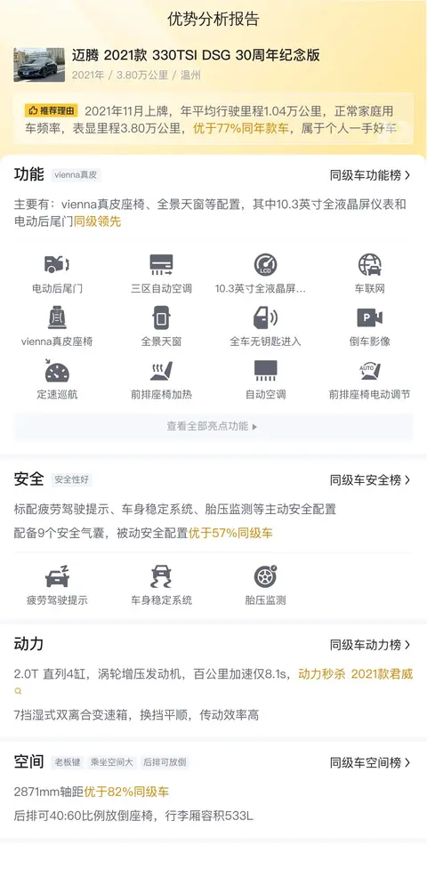 据估算,迈腾 2021款 330TSI DSG 30周年纪念版的用车成本是6433元/年,同级车最低是5601元/年,最高是14466元/年,所以它的用车成本偏低。