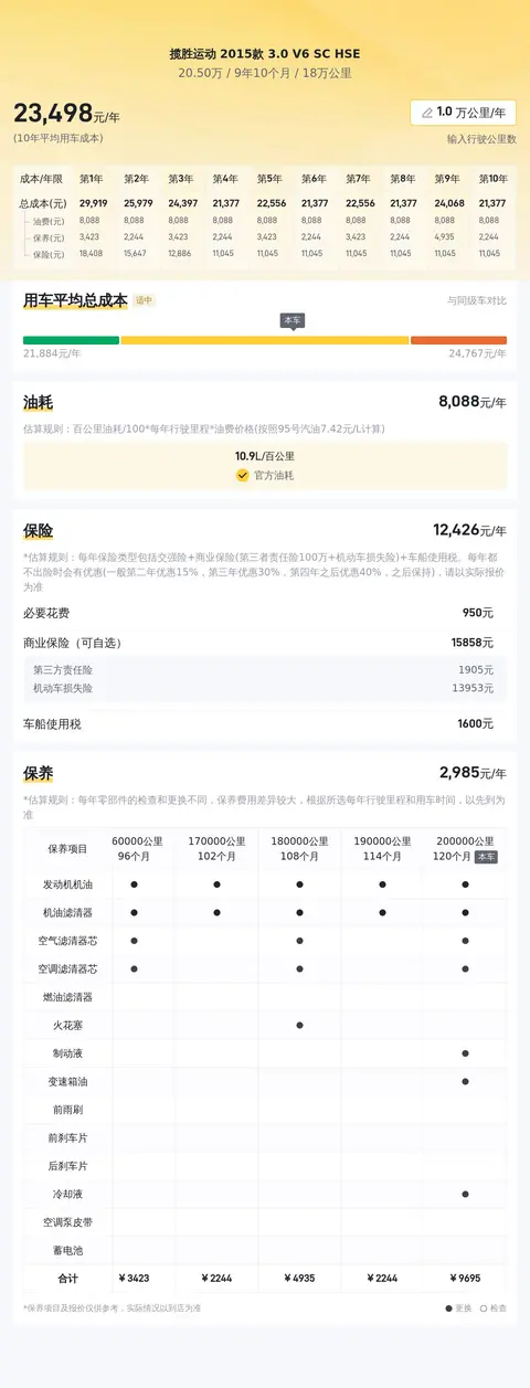 关于用车成本方面,根据相关数据估算,这款车型的百公里油耗约为10.9升,年均保养费用大约为5185元,年均保险费用约为13754元。总体来看,这款车型的使用成本相对较高,这主要是由于其豪华定位和较大排量的发动机所导致的。对于追求豪华品牌且能够承担相应使用成本的消费者来说,这款车无疑是一个不错的选择;但如果消费者更加注重经济性和实用性,可能需要考虑其他车型。 eachCarYearCostList