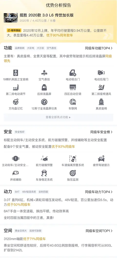 综上所述的新车含税价、用车成本、市场行情、优势分析、同款比价等数据仅供参考。在配置部分,因为二手车非标品,车辆可能会存在配置改装的情况,具体车况信息需要线下结合车辆实际情况进行综合参考。