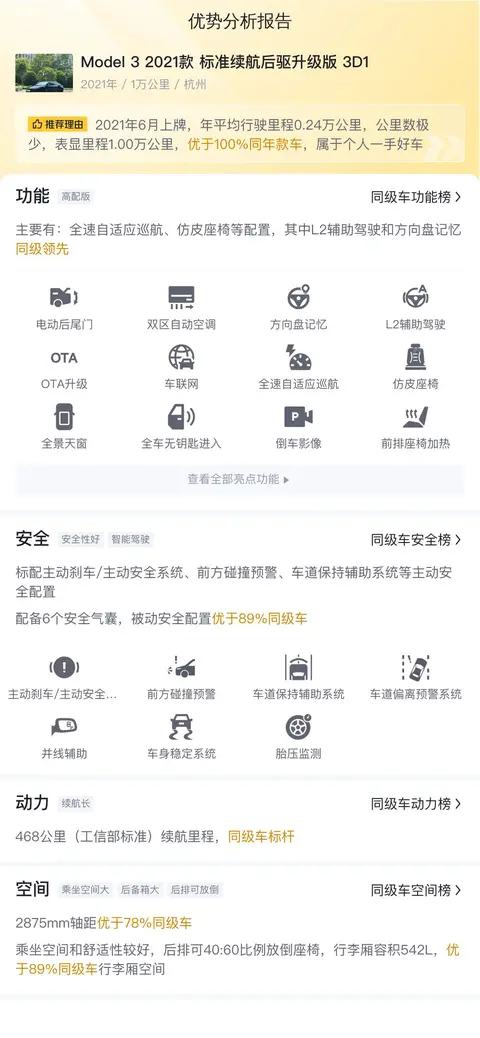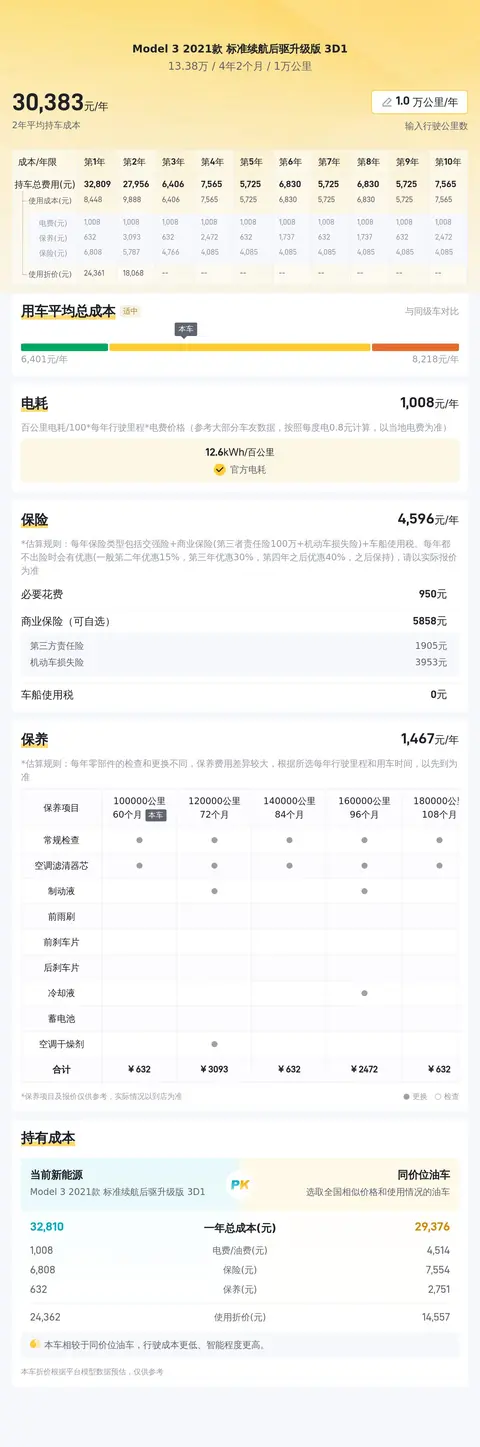 根据当前二手车市场的行情,这辆Model 3的售价相对合理,具有一定的性价比。关于用车成本,Model 3作为电动汽车,在能源消耗方面显著低于传统燃油车,且维护成本较低。根据估算,这辆车年均综合用车成本大概在每年3万元左右。然而,请注意,实际费用可能会根据车辆使用频率、地区电费差异、保养项目的不同等因素有所变动。