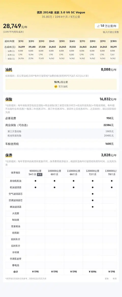 咱们来看看这辆车的市场行情和用车成本。根据大数据分析(可不是我瞎编的哦),这辆车的售价在35.8万,相较于其他同款车型,这个价格就像是打了折上折,简直就是“白菜价”中的战斗机!作为2015年的深圳牌照二手车,它保持着良好的车况和合理的行驶里程,这些都是让它价格坚挺的小秘密。当然,最终的售价还是要看具体的车况、里程数和保养情况,但可以肯定的是,这辆车绝对值得你把它带回家!至于用车成本嘛,根据估算,每年的油费+保险费+保养费大约是2.9万元,这个数字相比其他豪华SUV来说,算是比较“亲民”的了。油费嘛,按照百公里10.9L的油耗来算,每年跑个一万公里,油钱也不会让你钱包大出血;保险费一年约10602元,保养费一年约5210元,这些费用都能让你在享受驾驶乐趣的同时,钱包还能安稳地躺在你的裤兜里。