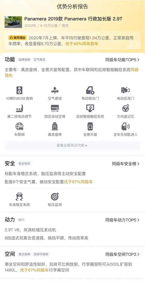 总之,这辆保时捷Panamera 2019款 Panamera 行政加长版 2.9T是一辆集豪华与性能于一身的四门跑车。它在动力、舒适性、智能互联以及安全性等方面均表现出色,是一辆值得推荐的豪华轿车。然而,其较高的维修保养成本和油耗也是潜在车主需要考虑的因素。与竞品车型相比,Panamera在品牌力、操控性和豪华感方面具有优势,但在后排空间和油耗经济性方面则相对弱势。总体而言,这辆Panamera是一款优秀的豪华四门跑车,但潜在车主需要根据自己的需求和预算来权衡其优缺点。