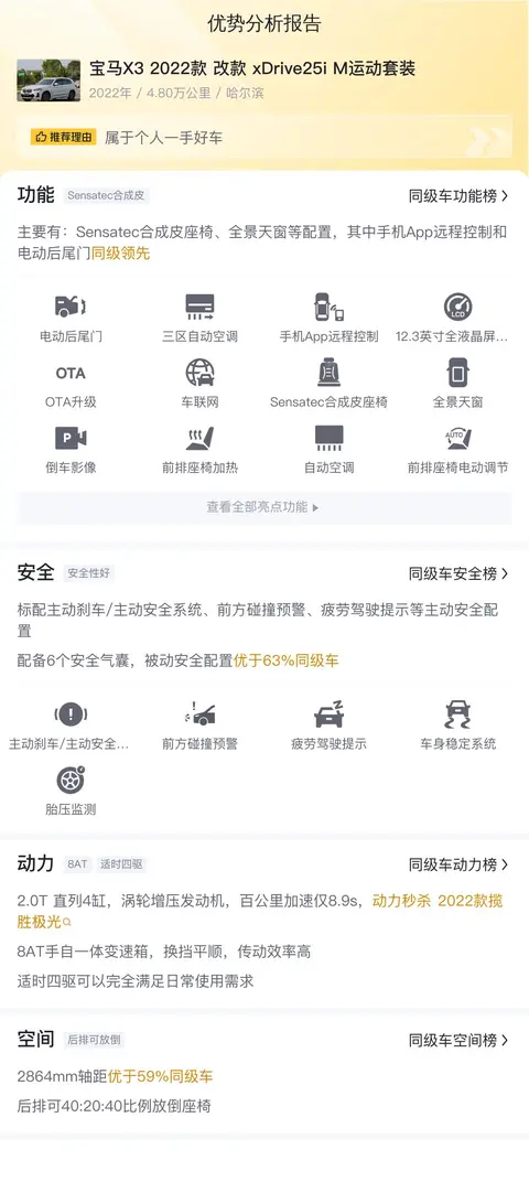 综上所述,宝马X3 2022款 xDrive25i M运动套装是一款集豪华与性能于一身的SUV。它搭载的2.0T发动机提供了出色的动力表现,而内饰的双大屏设计则营造出了强烈的科技氛围。外观设计时尚动感,让人过目难忘。然而,内饰材质和后排空间方面的不足,以及相对较高的售价和油耗,可能是消费者在购买时需要权衡的因素。总的来说,如果您追求驾驶乐趣、注重车辆品质和科技配置,并且预算相对充足,那么宝马X3 2022款 xDrive25i M运动套装无疑是一个值得考虑的选择。希望该分析能够在您选购车型的时候有所帮助。