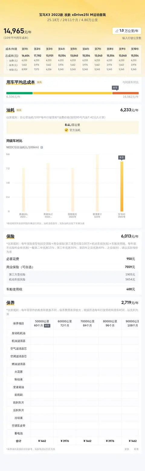 宝马X3 2022款 xDrive25i M运动套装的百公里油耗为8.4升(按照NEDC标准),每年的保养费用大约为3333元,保险费用约为6798元。这些数据基于懂车帝对这款车的分析,实际费用可能会根据您的驾驶习惯、用车环境及保险政策等因素有所变化。