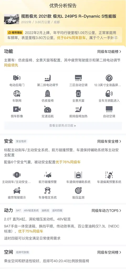 综上所述的新车含税价、用车成本、市场行情、优势分析、同款比价等数据仅供参考。在配置部分,因为二手车非标品,车辆可能会存在配置改装的情况,具体车况信息需要线下结合车辆实际情况进行综合参考。