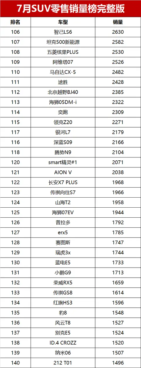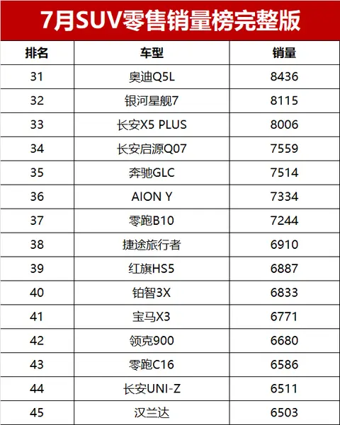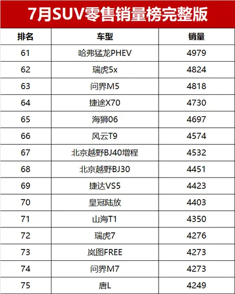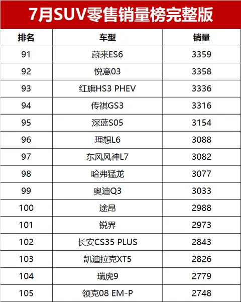 总体来看,2025年7月国内SUV市场竞争激烈,新能源与燃油车各有亮点。随着市场的不断发展,消费者在SUV车型的选择上也将更加丰富多样,各车企也将继续在产品研发和市场推广上发力,以争夺更多的市场份额。