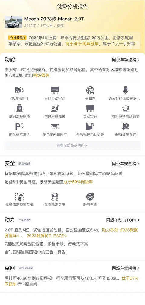 本篇介绍的Macan 2023款 Macan 2.0T,定位是中型SUV,车源地在杭州,上牌地是杭州。