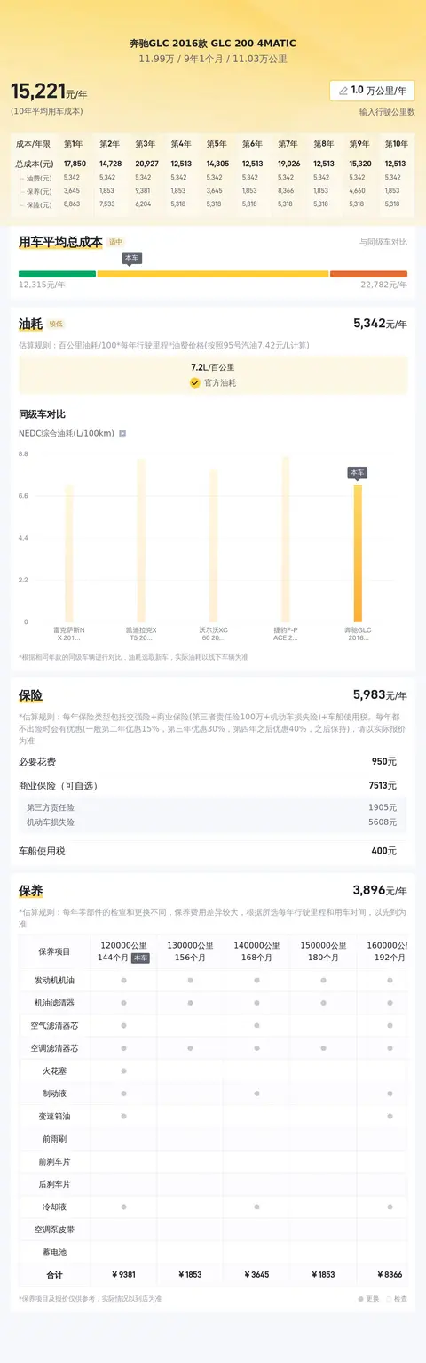 根据懂车帝的数据,这辆奔驰GLC的售价为11.99万,相较于同款车型,其售价更为优惠。在用车成本方面,这辆奔驰GLC的年均综合用车成本约为1.5万元,其中包括油费、保养费及保险费等。值得一提的是,该车目前为首付款3.3万元即可开回家的分期付款方案,对于资金紧张的消费者来说,无疑是一个不错的选择。