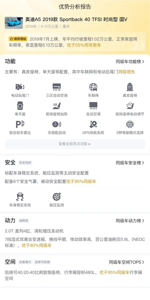 具体版本:奥迪A5 2019款 Sportback 40 TFSI 时尚型 国V