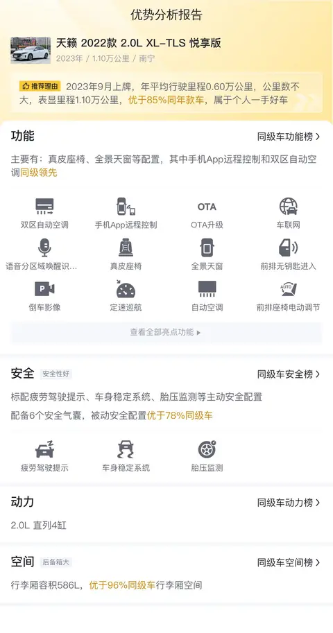 总的来说,这款二手天籁 2022款 2.0L XL-TLS 悦享版在车况、配置、性能等方面都表现不错,是一款性价比较高的车型。如果您正在寻找一款适合日常使用和商务出行的中型车,不妨考虑一下这款天籁。需要注意的是,车辆的实际状况和价格需要结合具体情况来进行评估和判断。希望这篇文章能够为您提供有用的信息,帮助您更好地了解这款车型。购车是一项重要的决策,请务必慎重考虑,选择最适合自己的车型。祝您购车愉快!