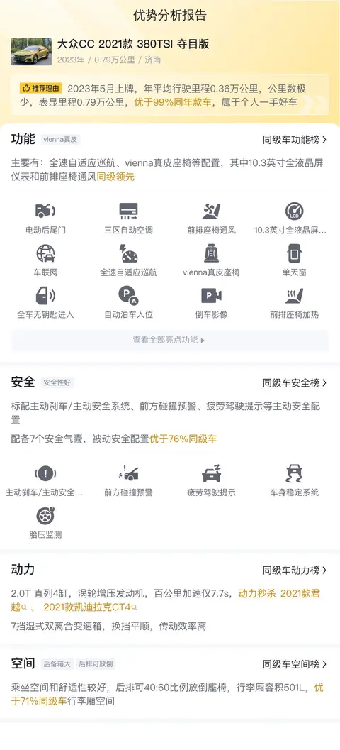 综上所述的新车含税价、用车成本、市场行情、优势分析、同款比价等数据仅供参考。在配置部分,因为二手车非标品,车辆可能会存在配置改装的情况,具体车况信息需要线下结合车辆实际情况进行综合参考。