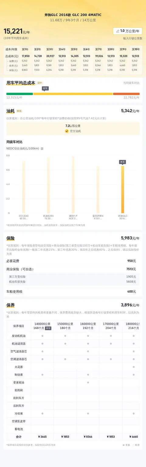 奔驰GLC 2016款 GLC 200 4MATIC的官方油耗为7.2L/百公里,按每年行驶2万公里计算,油费约为11520元。这辆车的保险费用大约为6109元/年,洗车美容按每季度一次,每年约1200元,不涉及停车费的情况下,一年的用车成本大约为18829元。需要注意的是,以上仅为估计值,实际费用可能会因人而异。