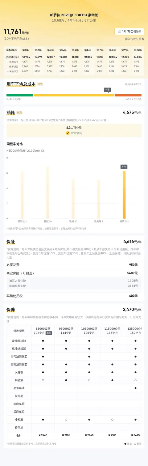 据估算,同级车的最低用车成本是6506元/年,最高是15798元/年,帕萨特 2021款 330TSI 豪华版是12564元/年,所以用车成本适中。