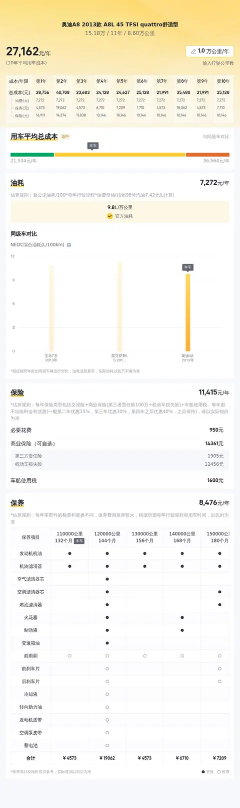 据估算,奥迪A8 2013款 A8L 45 TFSI quattro舒适型的用车成本较低,因为它的用车成本是26686元/年,同级车最低用车成本是26686元/年,最高是41446元/年。